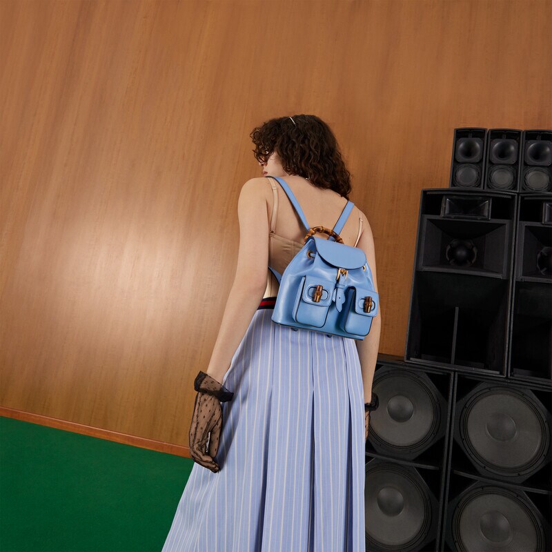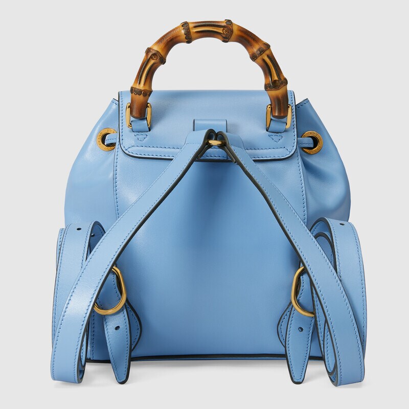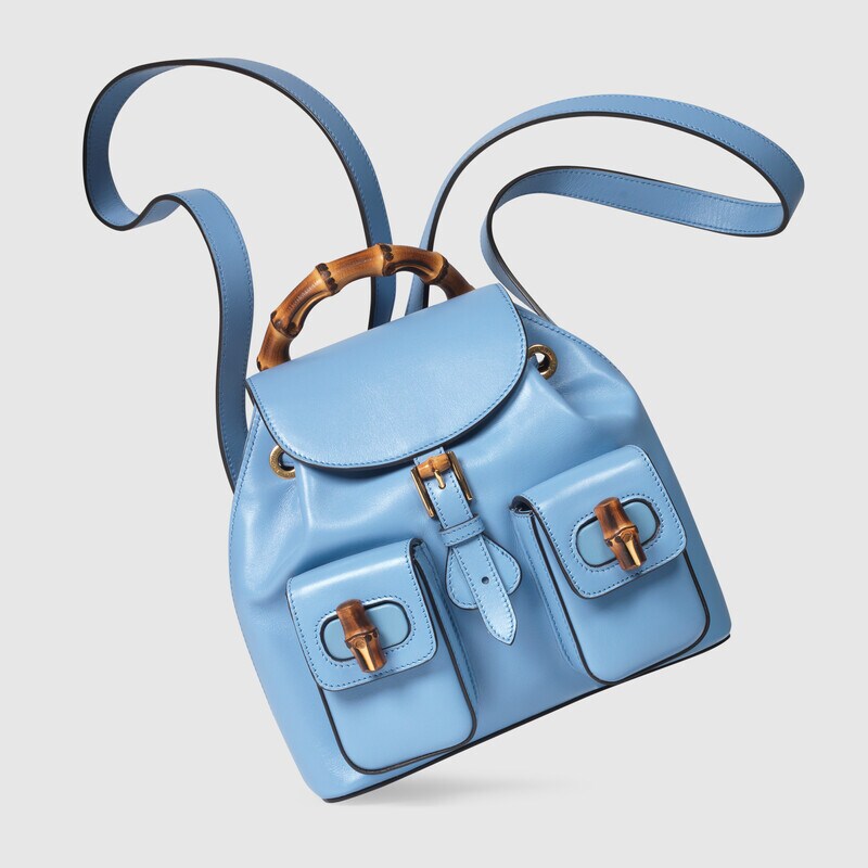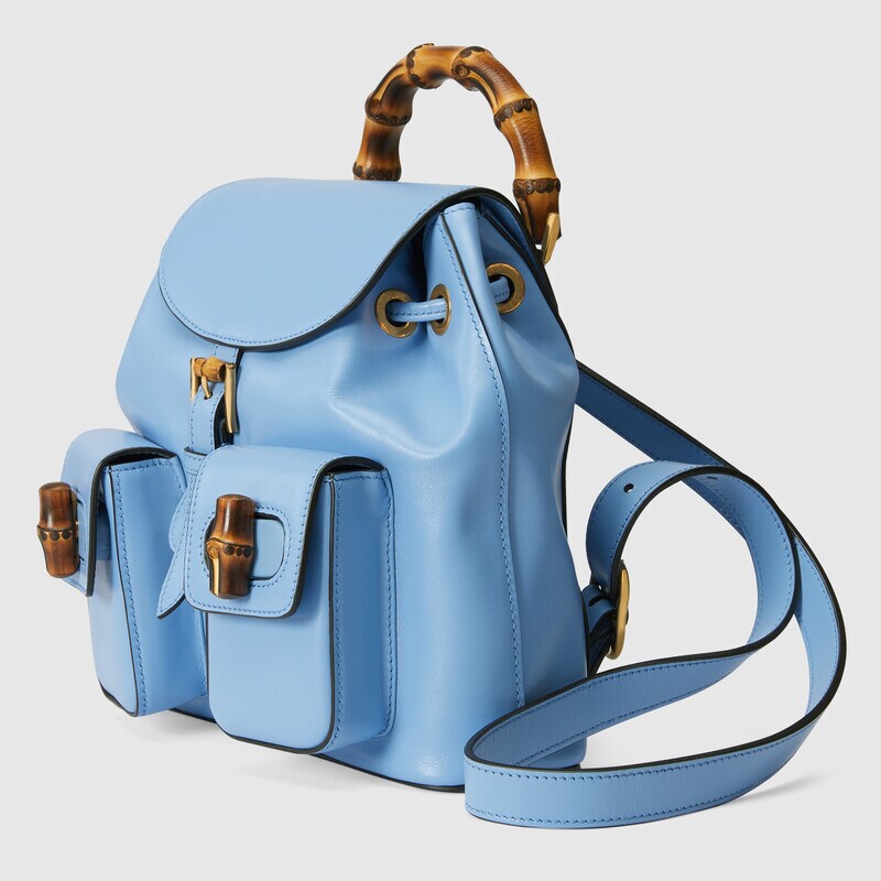 Paying homage to a material at the heart of Gucci’s heritage, this backpack is defined by its bamboo details. Crafted from smooth, light blue leather, the accessory is inspired by styles introduced in the House’s collections of the 90s.