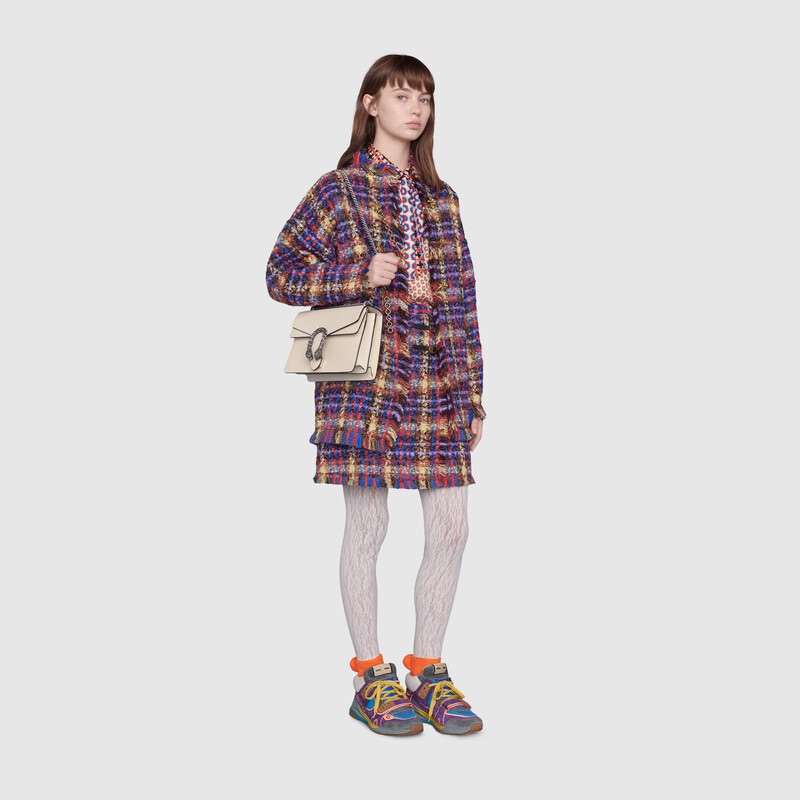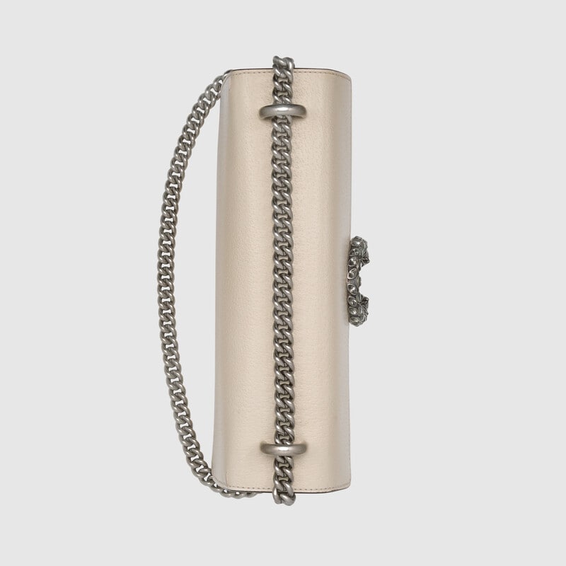 The Dionysus shoulder bag is presented in white textured leather with the now defining tiger head closure—a unique detail referencing the Greek god Dionysus. The closure is further enhanced with Swarovski crystals. The sliding chain strap can be worn multiple ways, changing between a shoulder and a top handle bag.