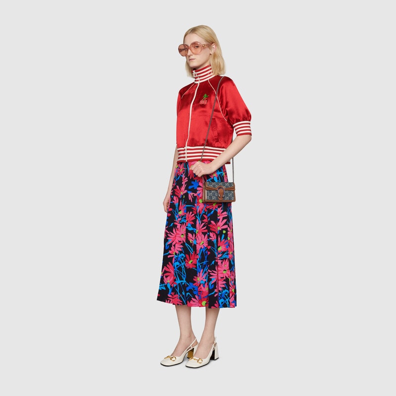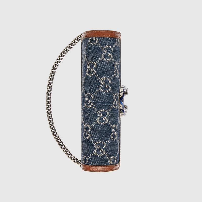 A part of the Epilogue collection, the super mini Dionysus is presented with a strong logo feel in GG eco washed organic jacquard. Continuing to frame House codes in new ways, the bag’s emblematic tiger head closure is enriched with vibrant blue enamel which complements the denim’s dark shade. The style is completed by a contrasting leather trim.