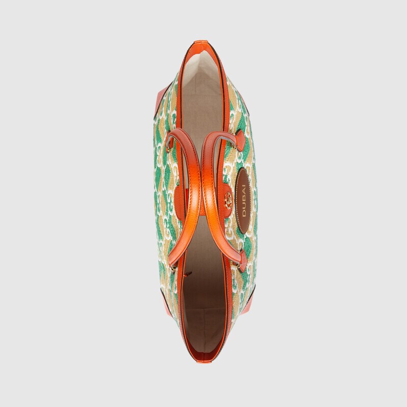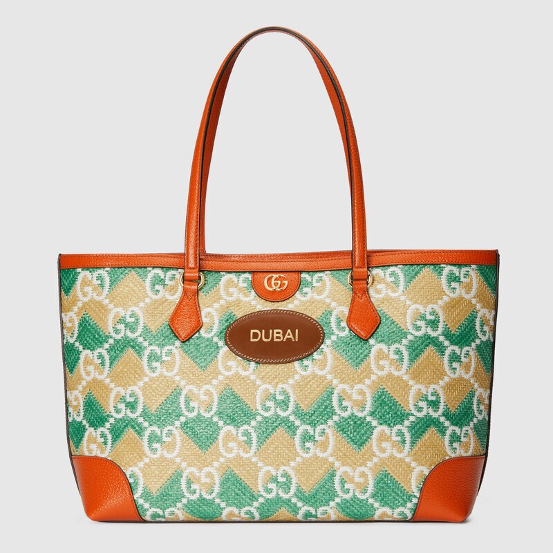 A special collection of pieces inspired by the vibrancy of world-renowned resort destinations presents a straw effect tote bag individualized with colours, trims and personalized details representing each location. ‘Dubai’—a city located in the United Arab Emirates, known as a luxury travel destination for leisure and business—is printed in metallic gold lettering on a leather patch, enriching the accessory.