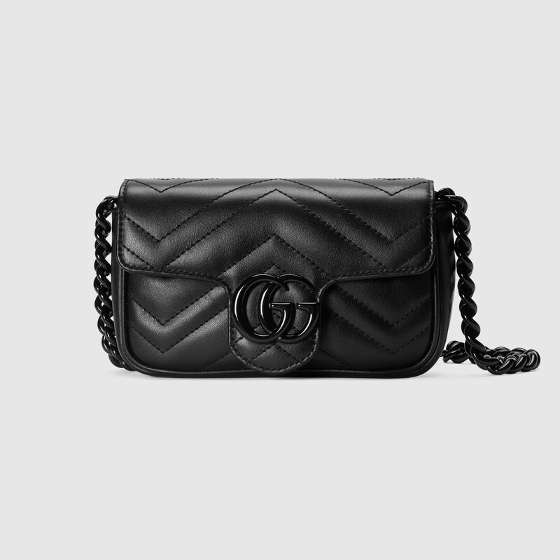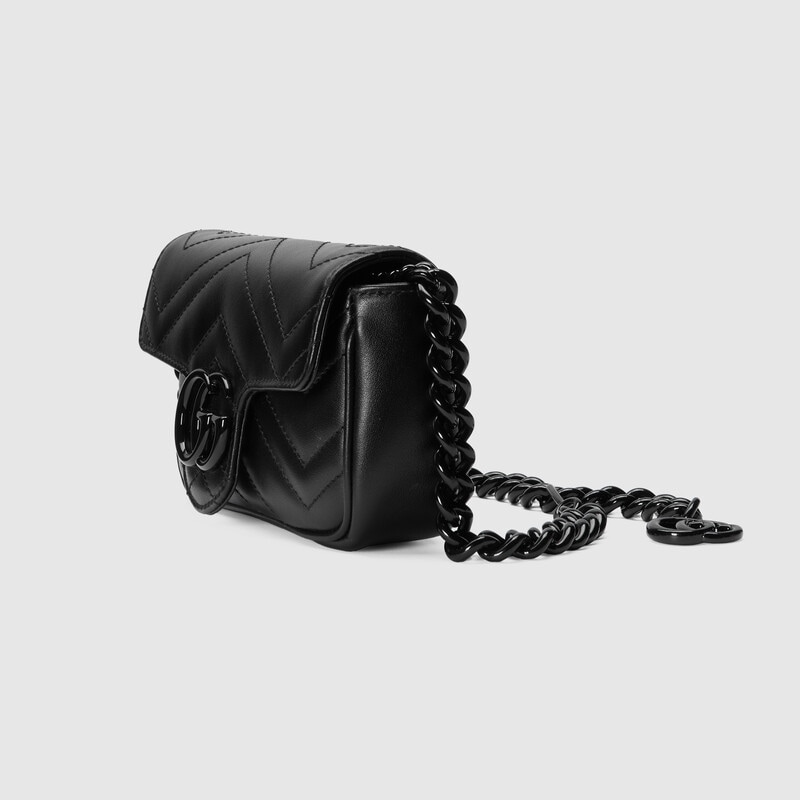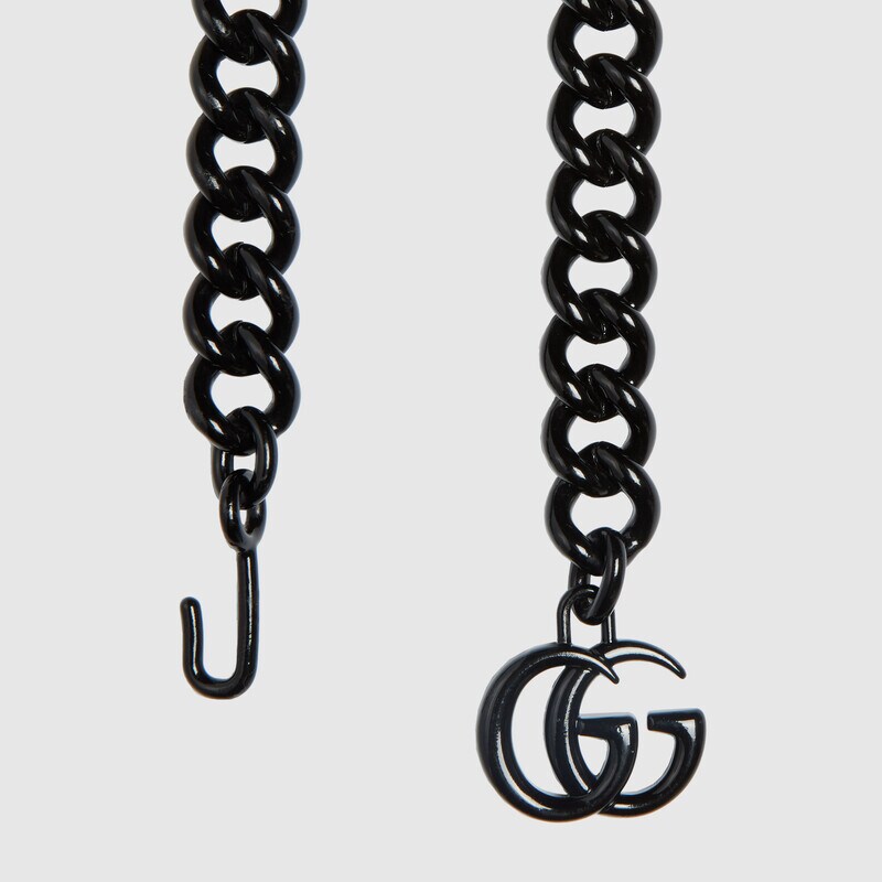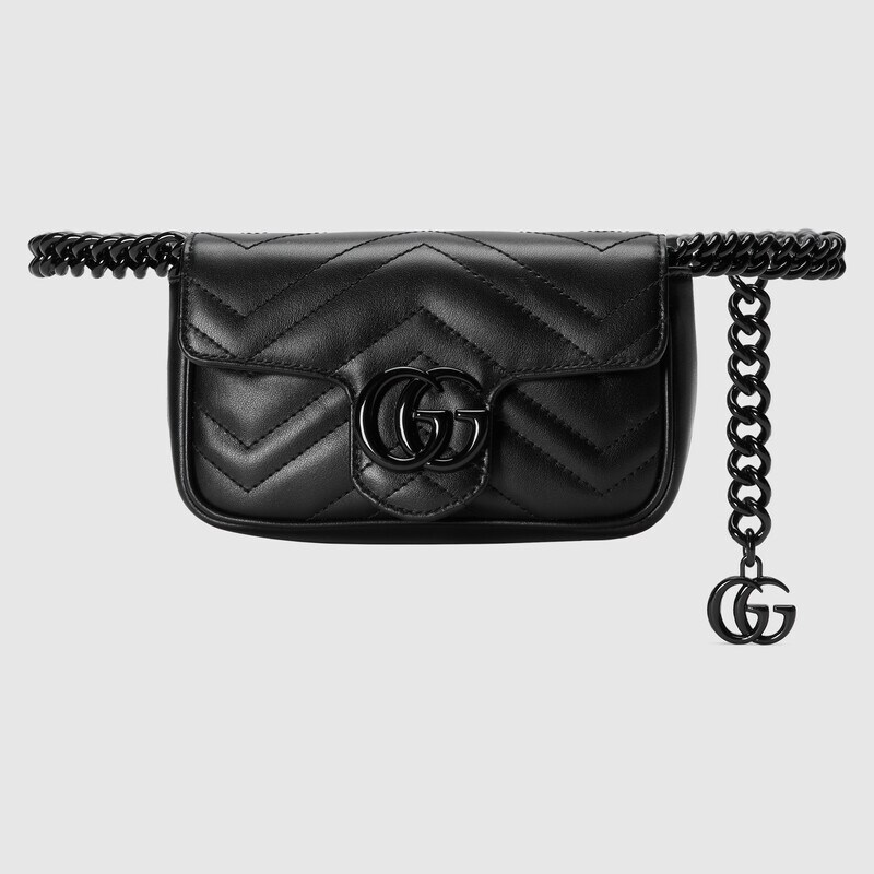Accessories continue to come to the fore of the Creative Director’s collections. A distinctly contemporary accessory, the belt bag is presented in new ways throughout the Gucci narrative, emphasizing different elements of the versatile style. Here, it is introduced as part of the GG Marmont universe in black chevron matelassé leather with a chain strap.