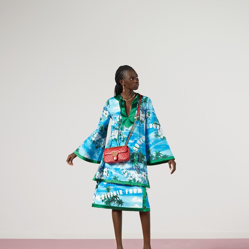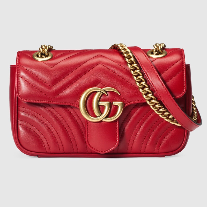 The small GG Marmont chain shoulder bag has a softly structured shape and an oversized flap closure with Double G hardware. The sliding chain strap can be worn multiple ways, changing between a shoulder and a top handle bag. Made in matelassé chevron leather with a heart on the back.