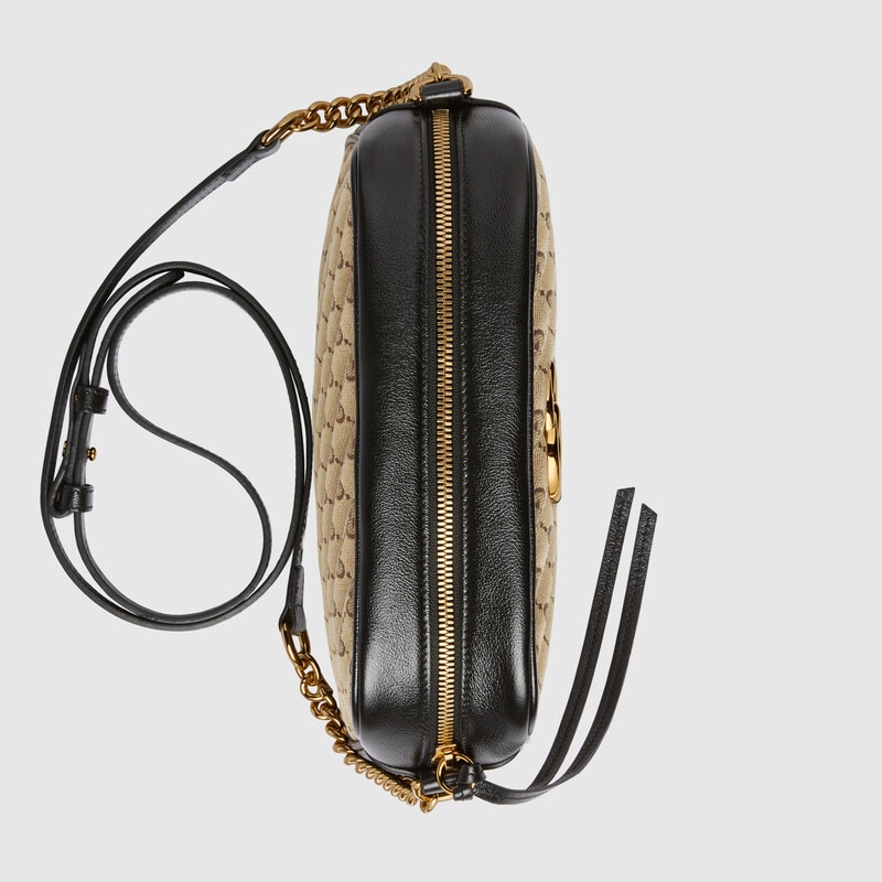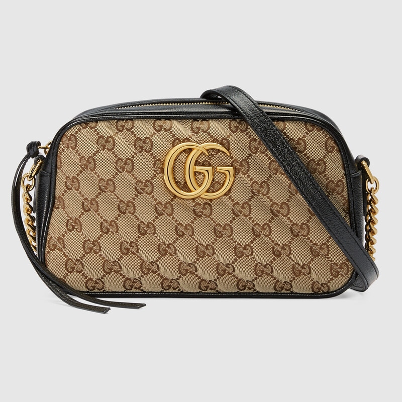 The zip-top GG Marmont chain shoulder bag is reimagined for Spring 2020 in an iteration that plays with the House’s logo. Gucci’s Original GG canvas is presented with a quilted diagonal matelassé technique, trimmed with black leather. The front is defined by the archival Double G hardware from the ’70s, now presented in a luminous gold tone.