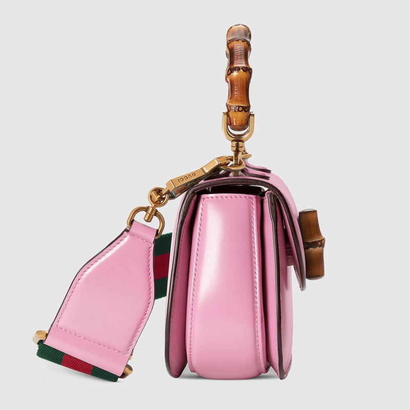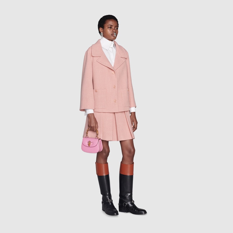 Heritage elements are reimagined with a contemporary twist throughout the Aria collection. An emblem of Gucci’s origins, bamboo has appeared throughout the House’s collections since the ’40s. After over eight decades, the material defines this leather mini bag. The accessory is presented in a delicate shade of pink, enriching it with a soft dreamlike feel.