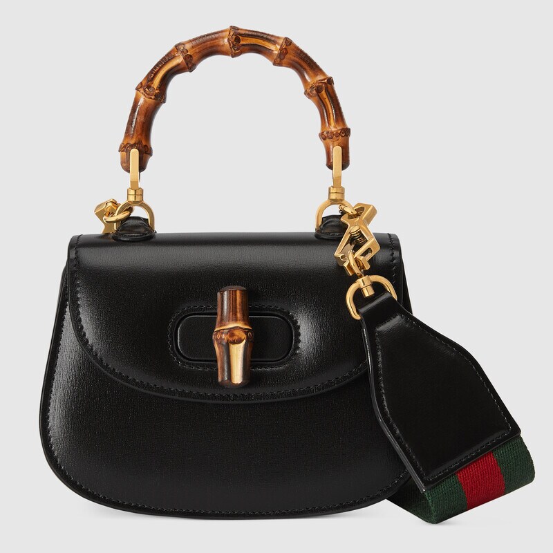 Intricate craftsmanship is a defining feature of the Gucci universe. An emblem of Gucci’s origins, bamboo has appeared throughout the House’s collections since the ’40s when in the post-war period it was difficult to find traditional materials. Decades later, the Gucci Bamboo 1947 reinterprets the hardware, pairing it with smooth black leather. Adding a whimiscal note to the design, the top handle bag is introduced in a mini size.