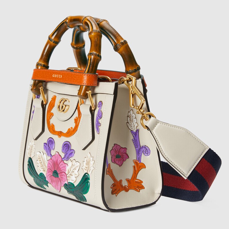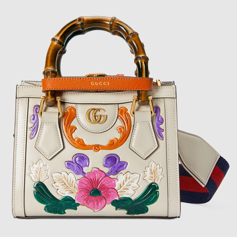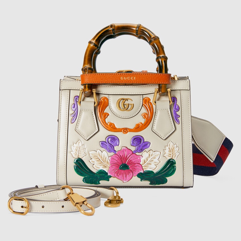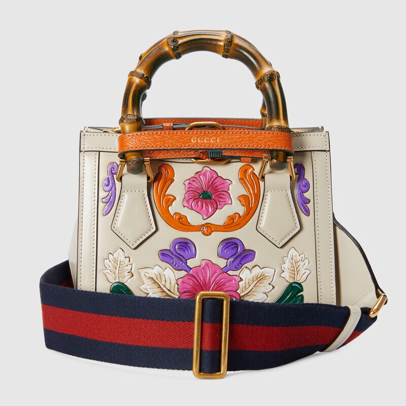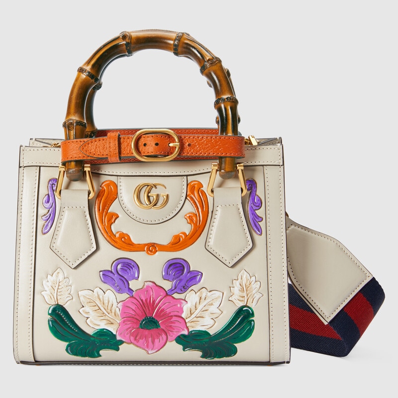 Reimagining the Gucci Diana, this mini tote bag combines the craftsmanship behind the House’s designs with botanical influences. The white leather is engraved with an abstract floral design that has then been painted by hand with bright colours.
