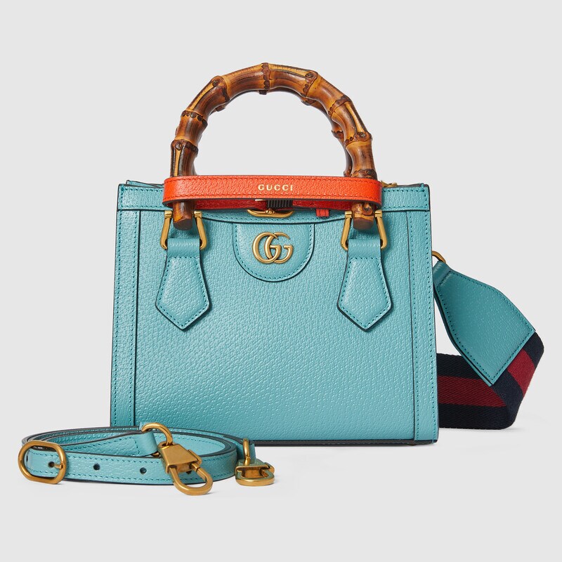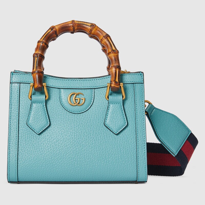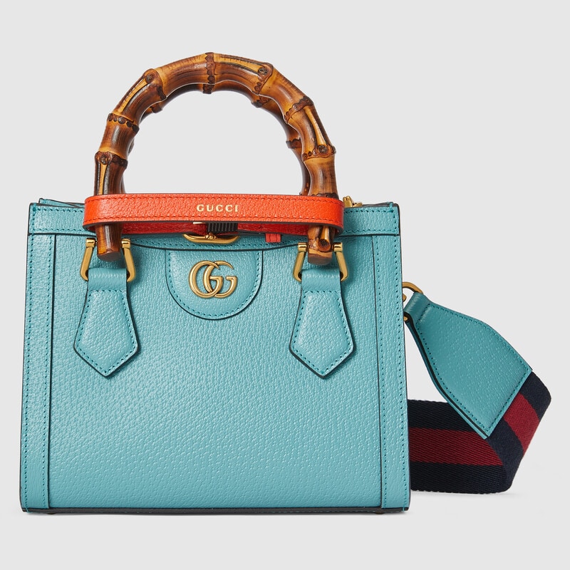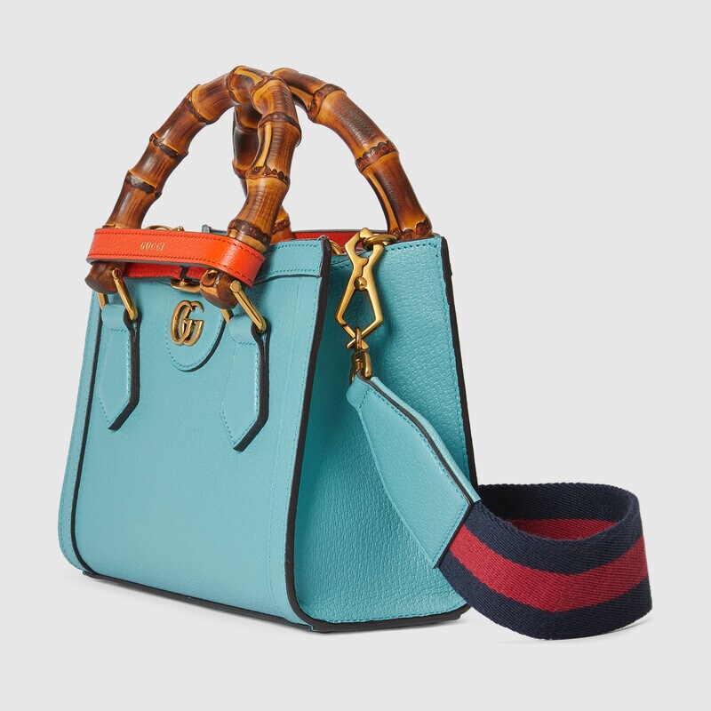 An evolution of a bamboo handle tote first introduced in 1991, the Gucci Diana represents the notion of style in constant evolution and is reimagined with removable, neon leather belts a nod to the functional bands used to keep the handles in shape. Here, a mini version of the emblematic style is presented in light blue leather.