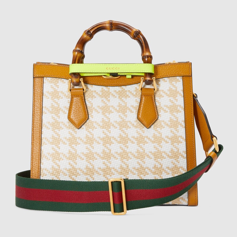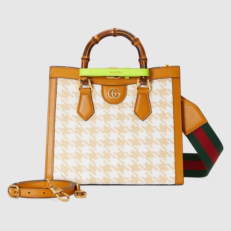 A reflection of the House’s fascination with different decades and vintage designs, this small Gucci Diana tote has an allover white and beige houndstooth motif. The pattern originated in Scotland in the 1800s but is reinvented for Gucci Love Parade in a raffia effect fabric, adding a romantic feel.