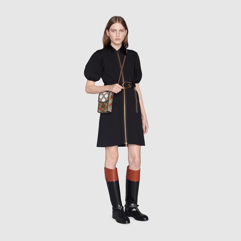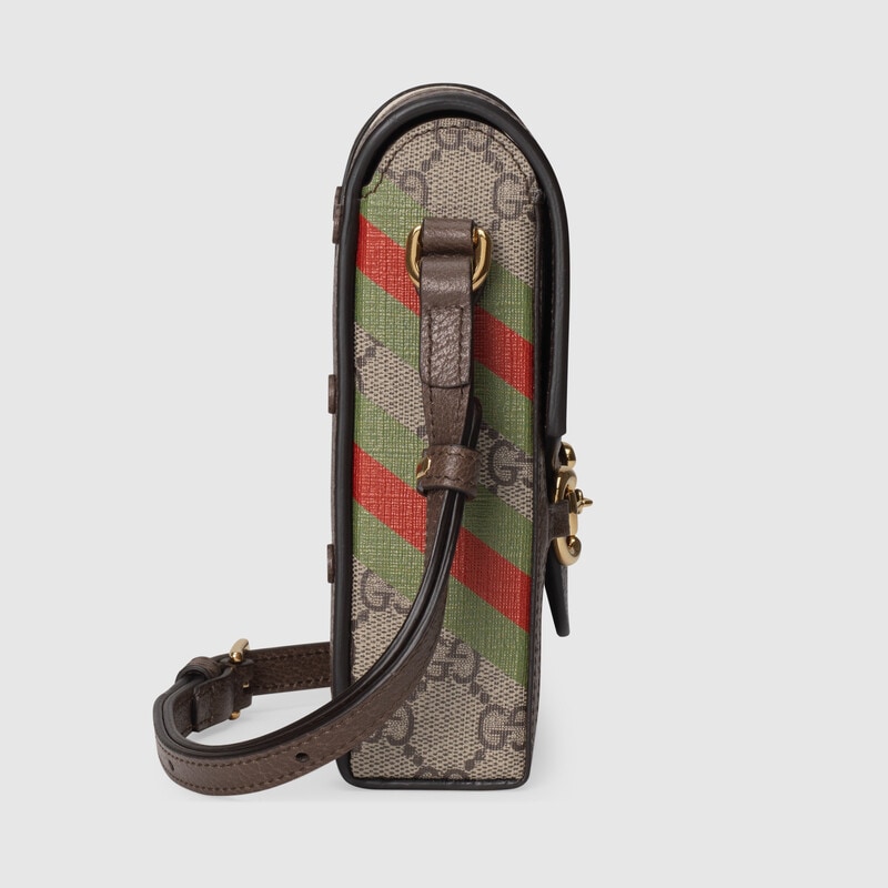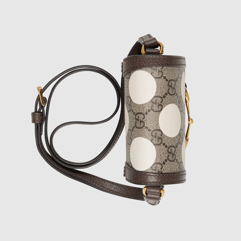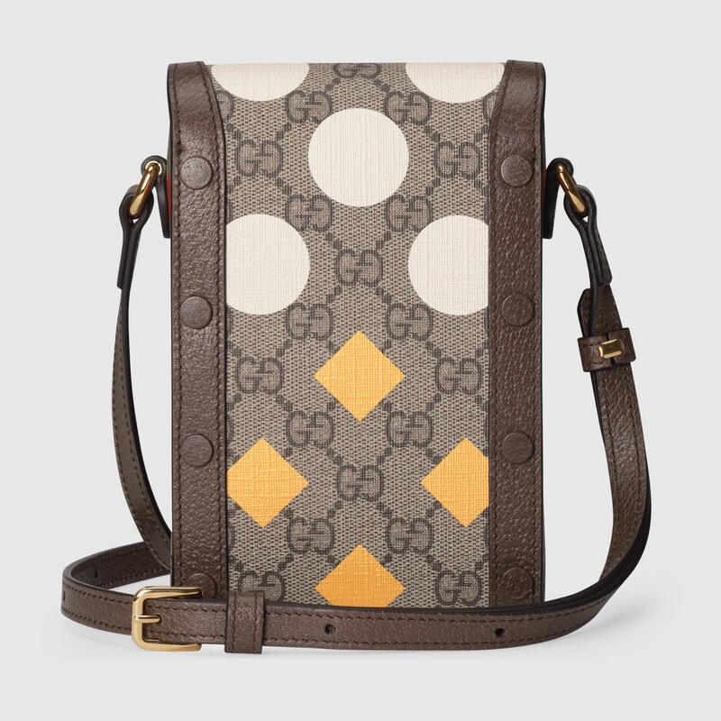 This item features bright and colourful geometric motifs that recall the uniforms worn by horse riding jockeys. The collection is inspired by the Parade Ring, or paddock, where horses walk around as a warm-up before the race and to help racegoers pick a winner. Here the print appears on this Gucci Horsebit 1955 mini bag.