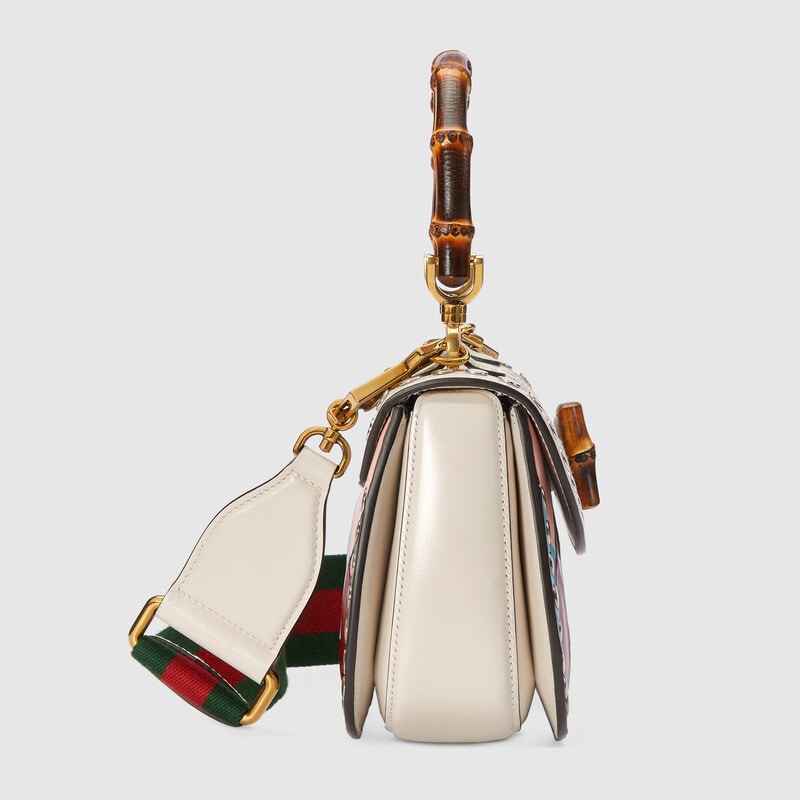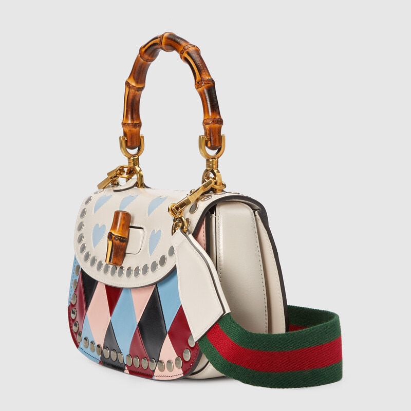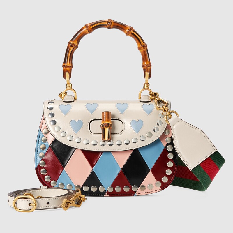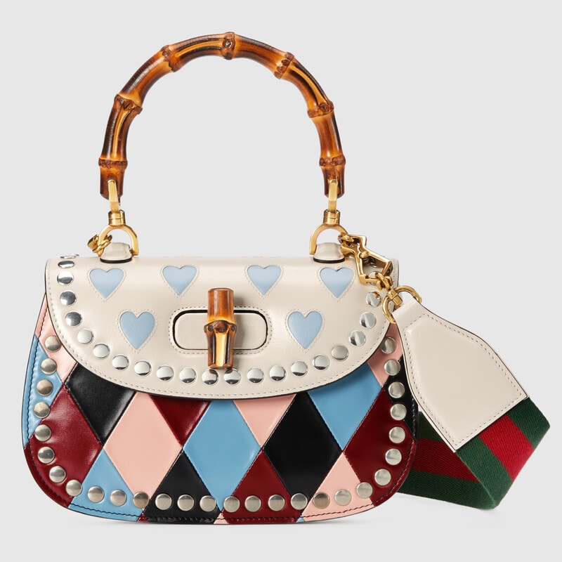The House presents a whimsical collection of ready-to-wear, shoes and accessories in a colourful palette. As a joyful reinterpretation of Gucci’s heritage, hearts and rhombus motifs appear alongside floral accents imbuing the selection with a romantic feel that celebrates love. A rhombus print in light blue and pink leather defines this Gucci Bamboo 1947 small top handle bag, a cut-out heart motif completes the silhouette trim.