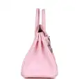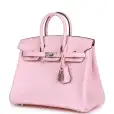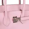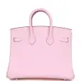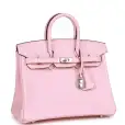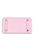 This Birkin is of Rose Sakura swift leather with palladium hardware and features tonal stitching, front flap, two straps with center toggle closure, clochette with lock and two keys, and double rolled handles.