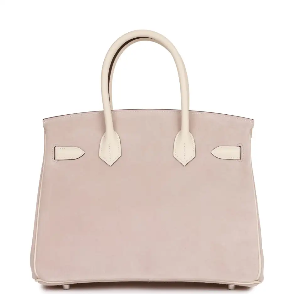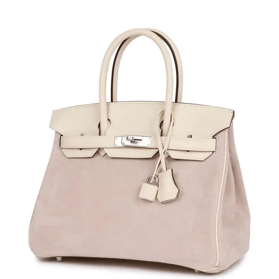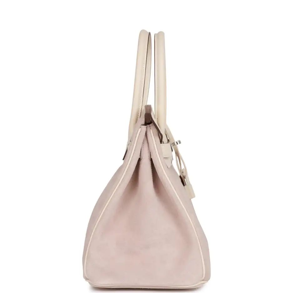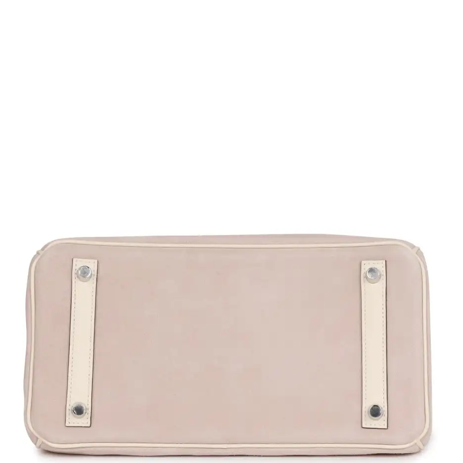 This Birkin is in Glycine grizzly and Nata swift leather with palladium hardware and has tonal stitching,front flap, two straps with center toggle closure, clochette with lock and two keys, and double rolled handles.