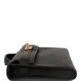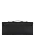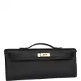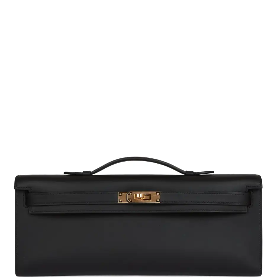 This Kelly Cut is in Black swift leather with gold hardware and has tonal stitching, two straps with front toggle closure and a top flat handle.
