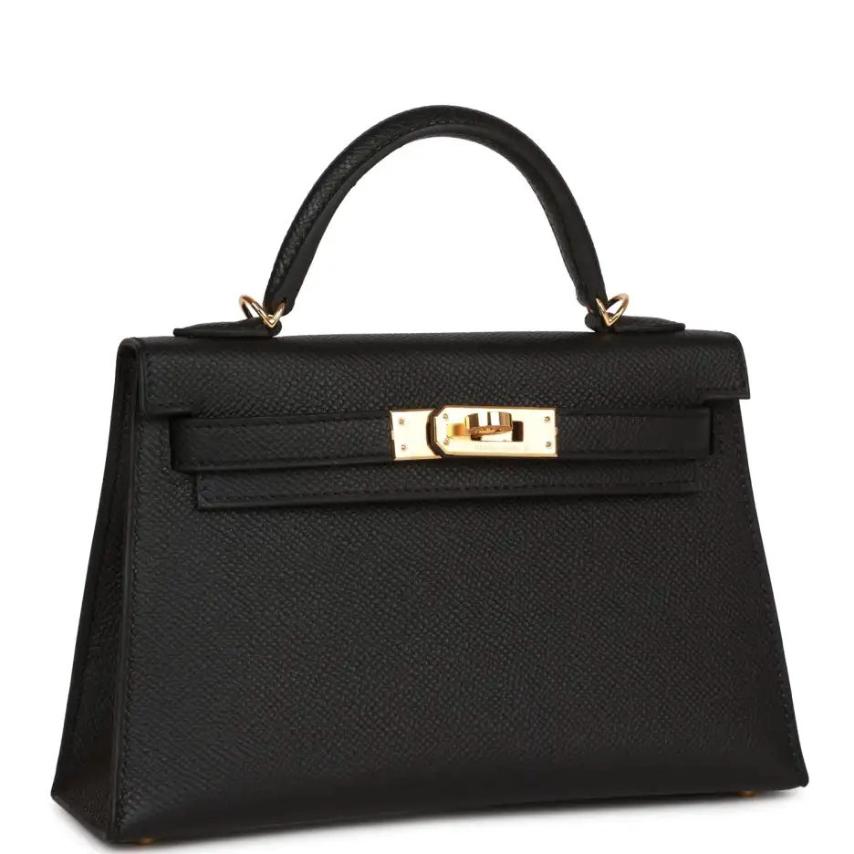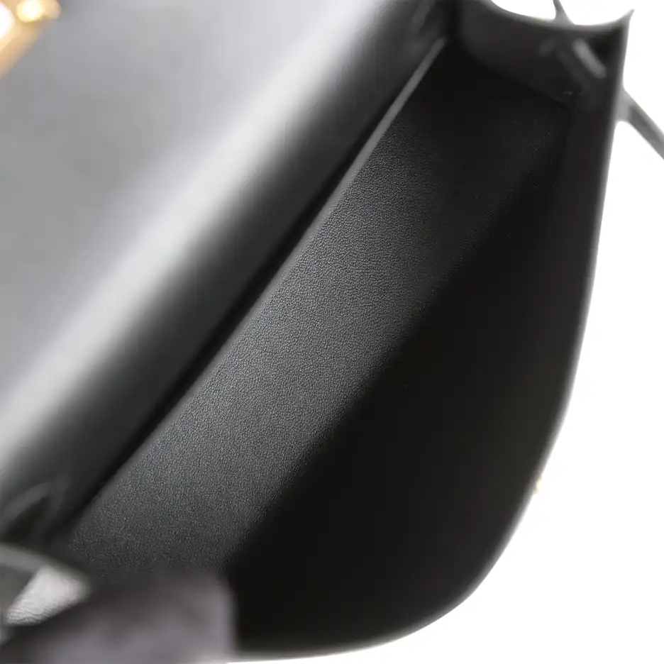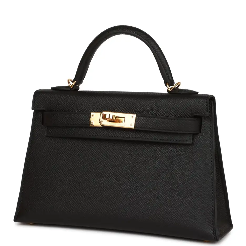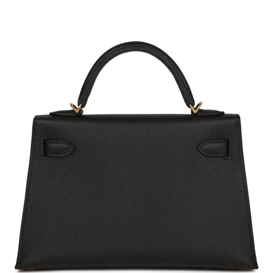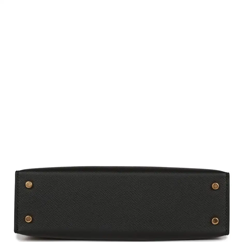 This tiny Kelly, in the Sellier style, is in black epsom leather with gold hardware and has tonal stitching, two front straps with front toggle closure, single rolled handle and removable shoulder strap.