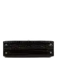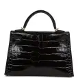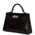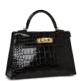 This tiny Kelly, in the Sellier style, is in Black shiny Mississippiensis alligator with gold hardware and has tonal stitching, two front straps with front toggle closure, single rolled handle and removable shoulder strap.