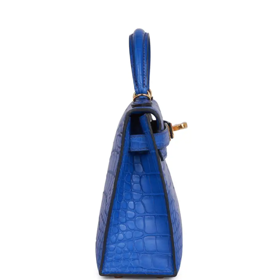 This tiny Kelly, in the Sellier style, is in Bleu Royal matteMississippienis alligator with gold hardware and has tonal stitching, two front straps with front toggle closure, single rolled handle and removable shoulder strap.