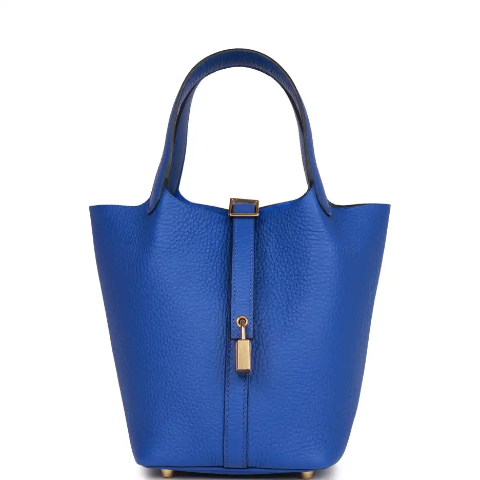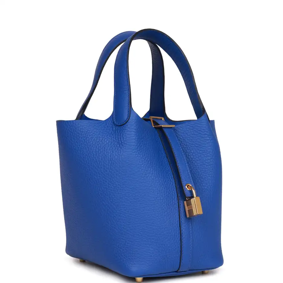 This Picotin Lock is in Bleu Royal clemence leather with gold hardware and has tonal stitching with two top handles.