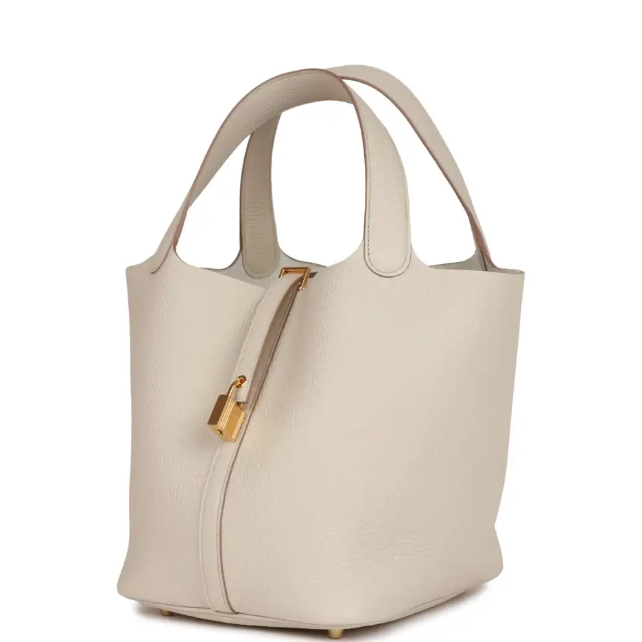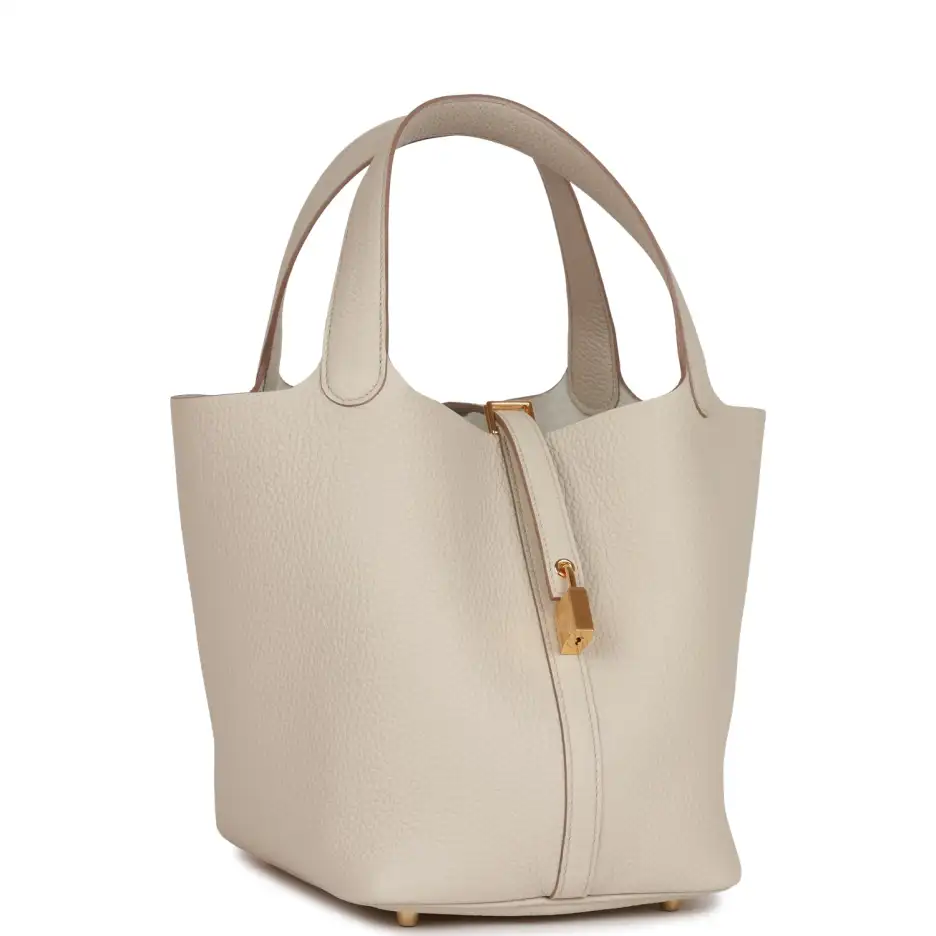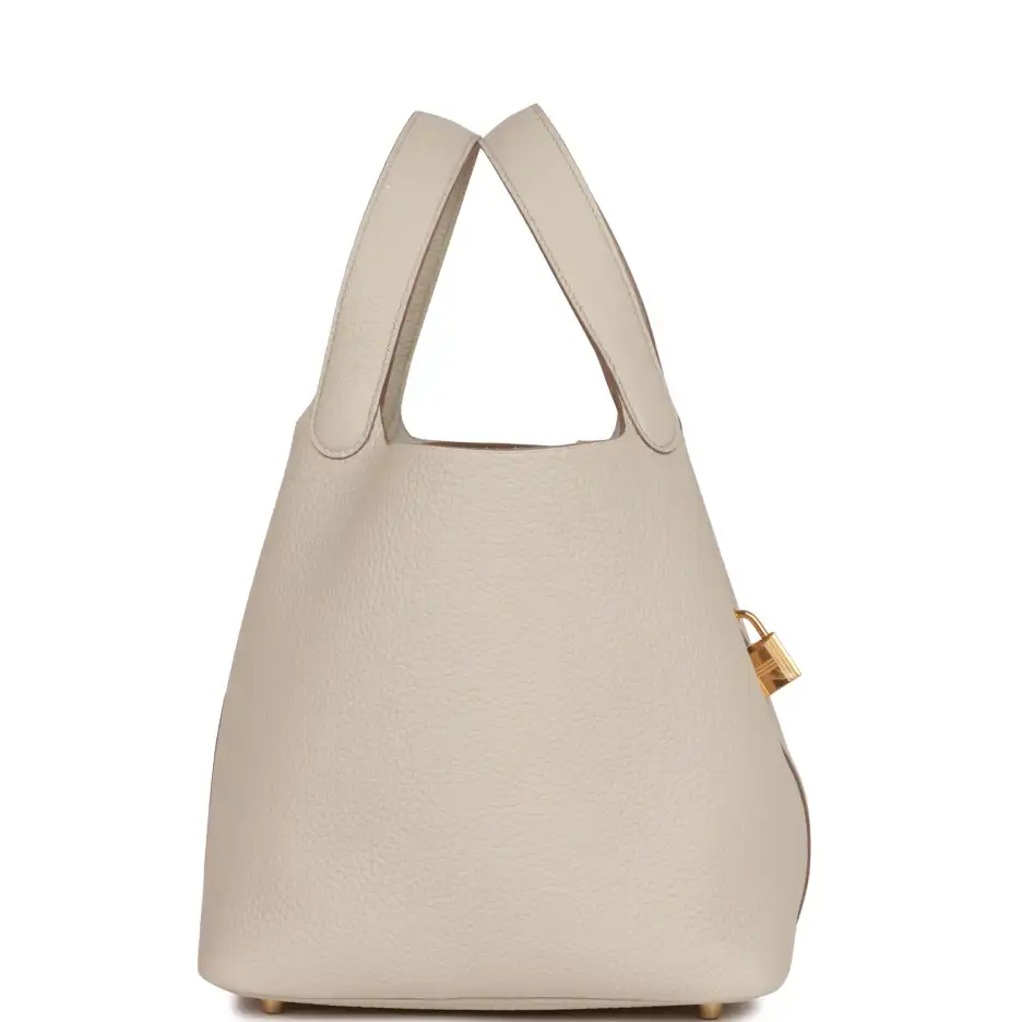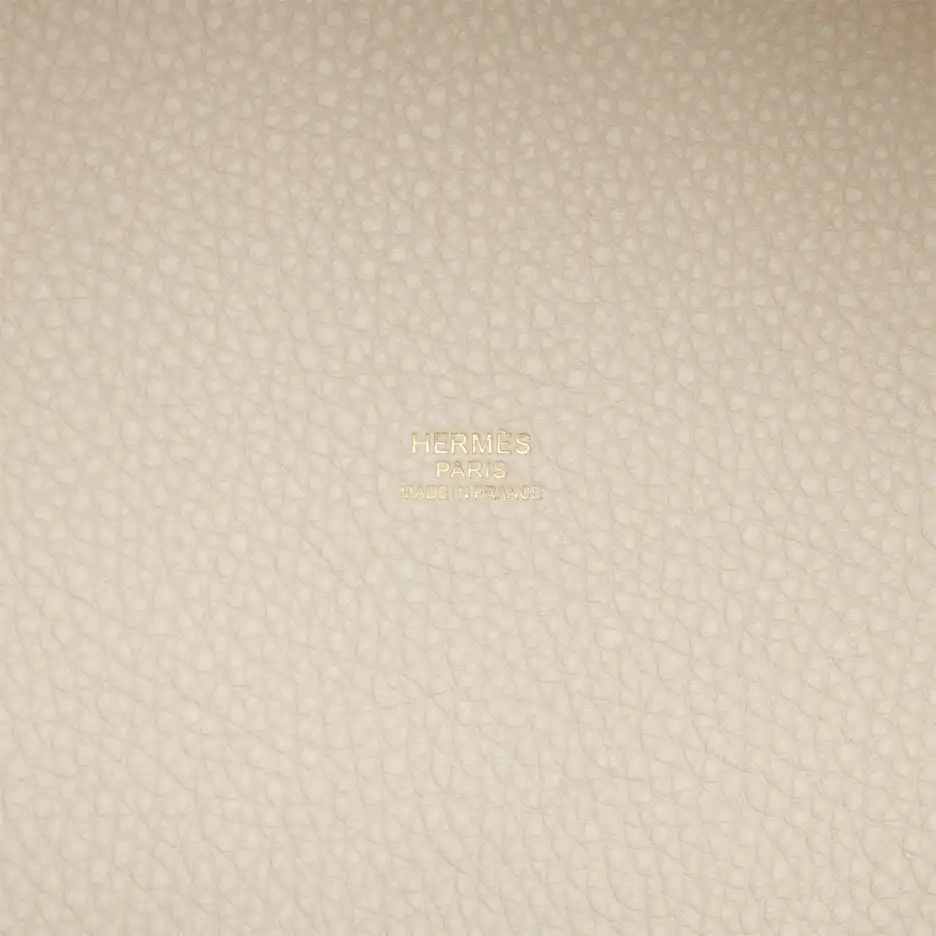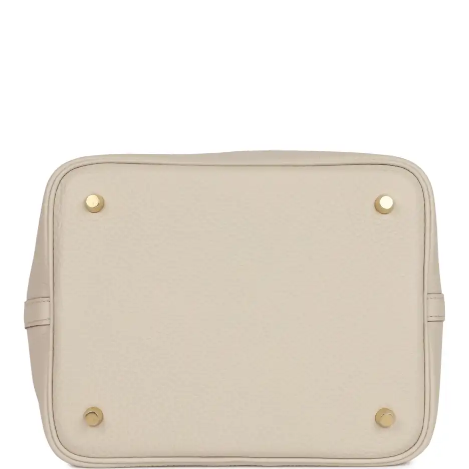 This Picotin is in Beton clemence leather with gold hardware and has tonal stitching with two top handles.