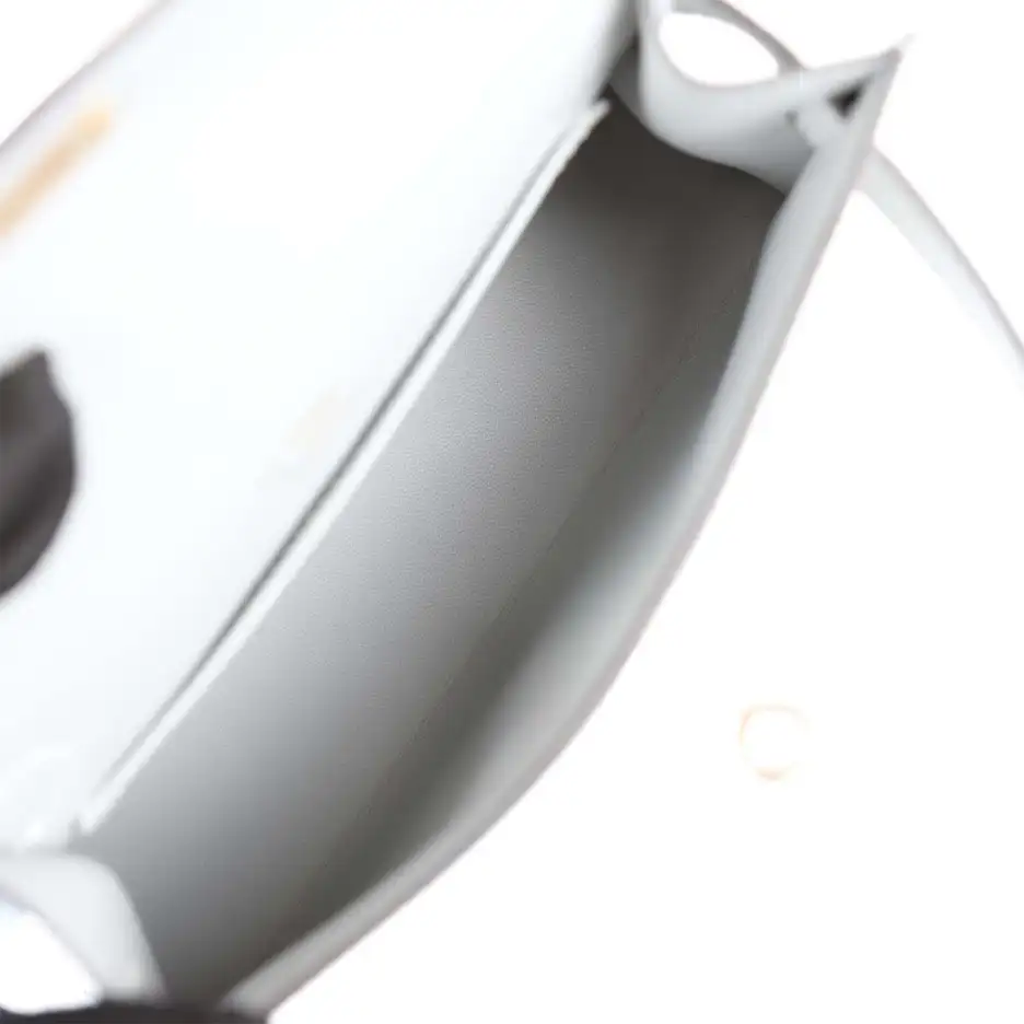This tiny Horseshoe Stamp Casaque Kelly, in the Sellier style, is in Bleu Brume and Gris Meyer epsom leather with permabrass hardware and has contrast stitching, two front straps with front toggle closure, single rolled handle and removable shoulder strap.