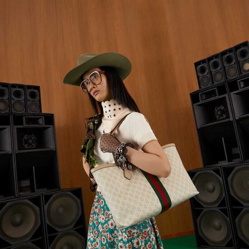 A heritage material from the archive, GG Supreme has been reimagined in Gucci Love Parade in different colour combinations and combined with contemporary as well as classic styles. The Ophidia tote is presented in a beige and white variation of the signature material with a tonal trim. Originally a play on a ’30s design, the canvas speaks to the historical narrative that runs throughout the collection.