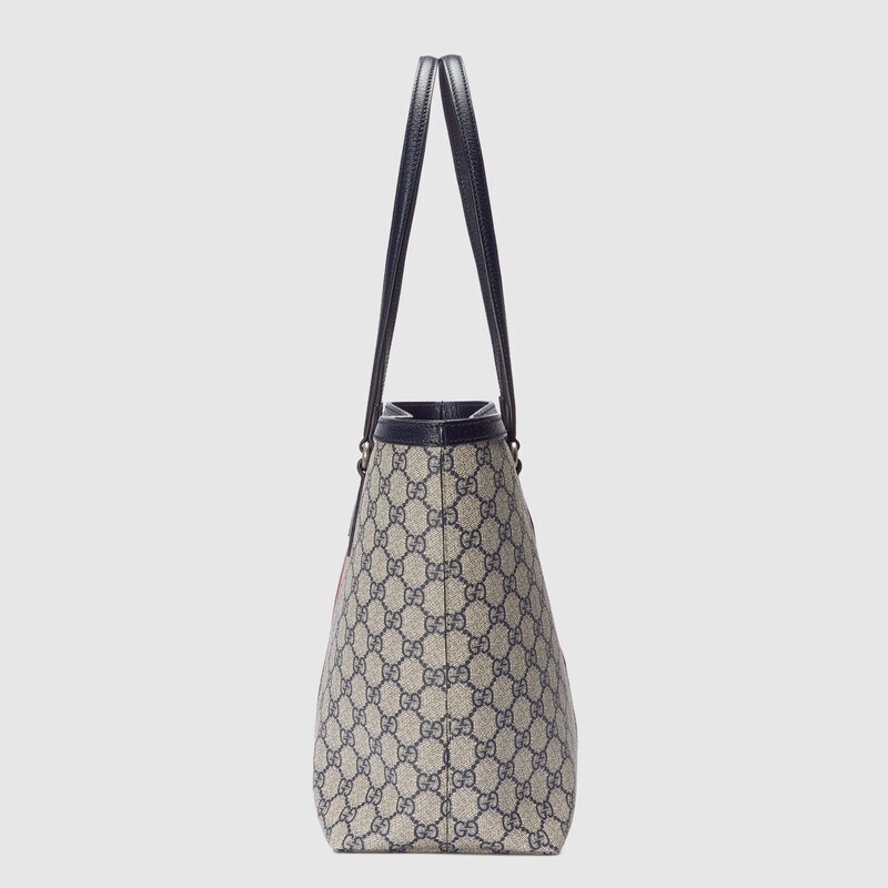 Mirroring the material’s historic origins, GG Supreme is introduced in a timeless mix of blue and beige for Gucci Love Parade. The canvas has come to the front of each collection decade after decade to become a hallmark of the House. Here, the classic palette defines this medium-sized Ophidia tote bag, completed by the Web stripe in red and blue.