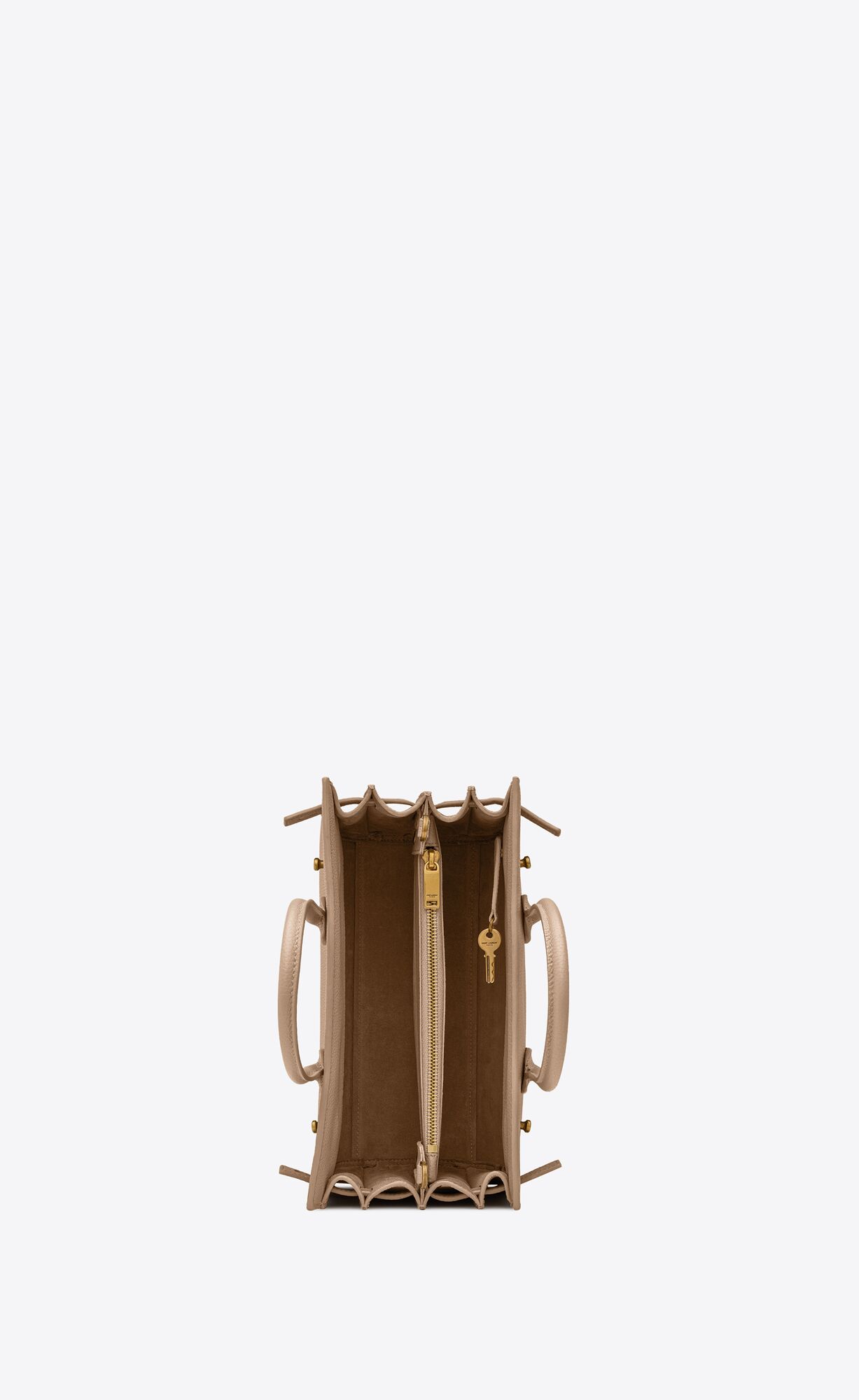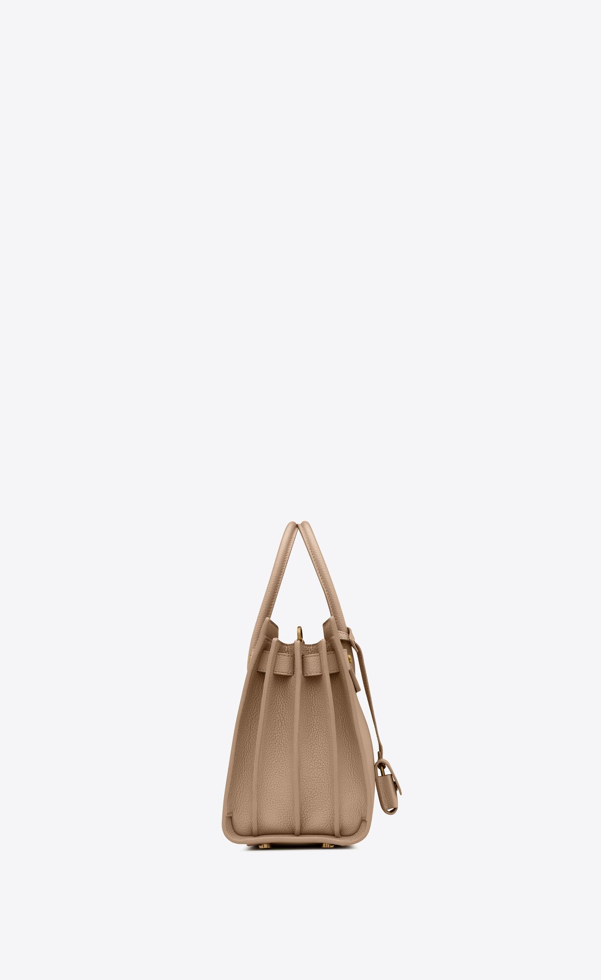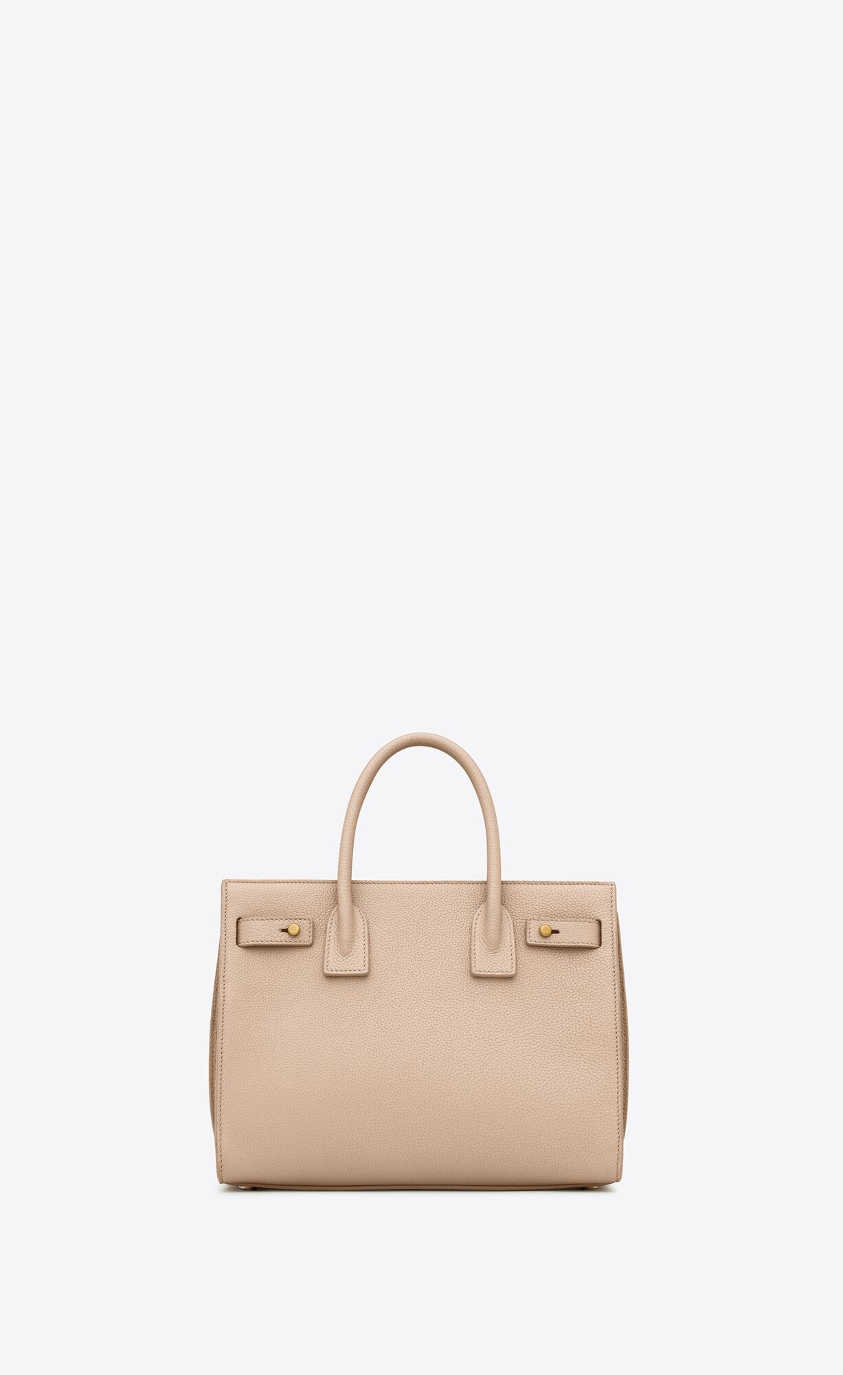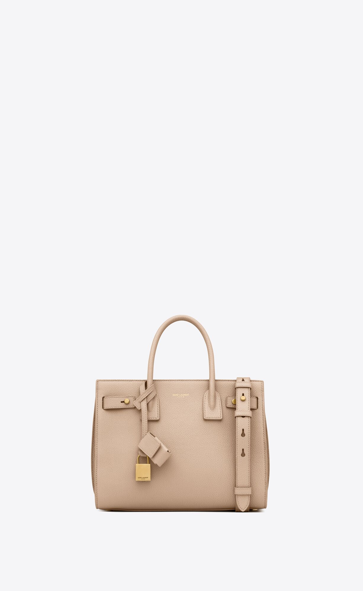 Roomy and leather-lined, it is distinguishable by its accordion sides, snap tabs and brass padlock.