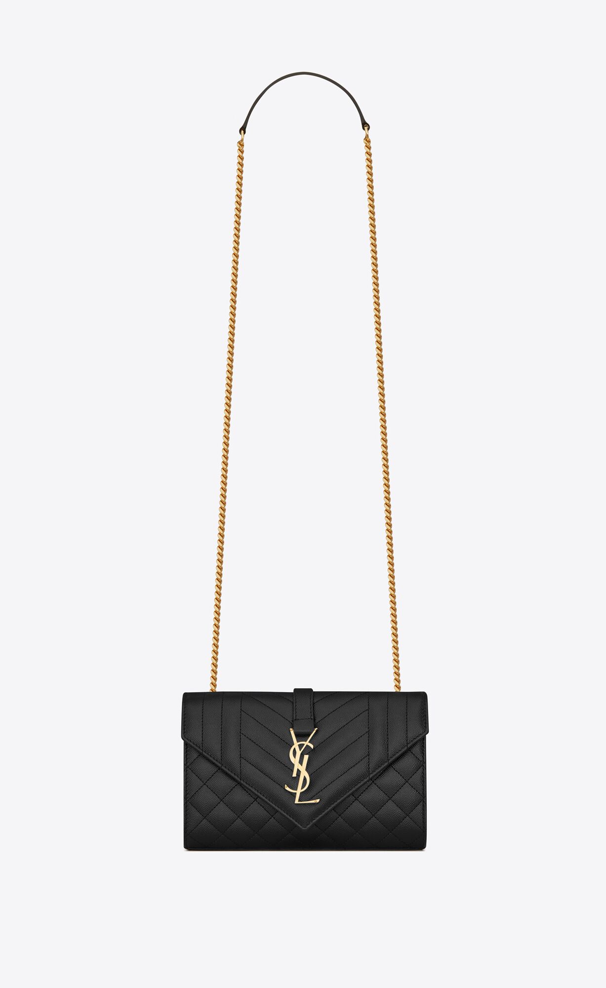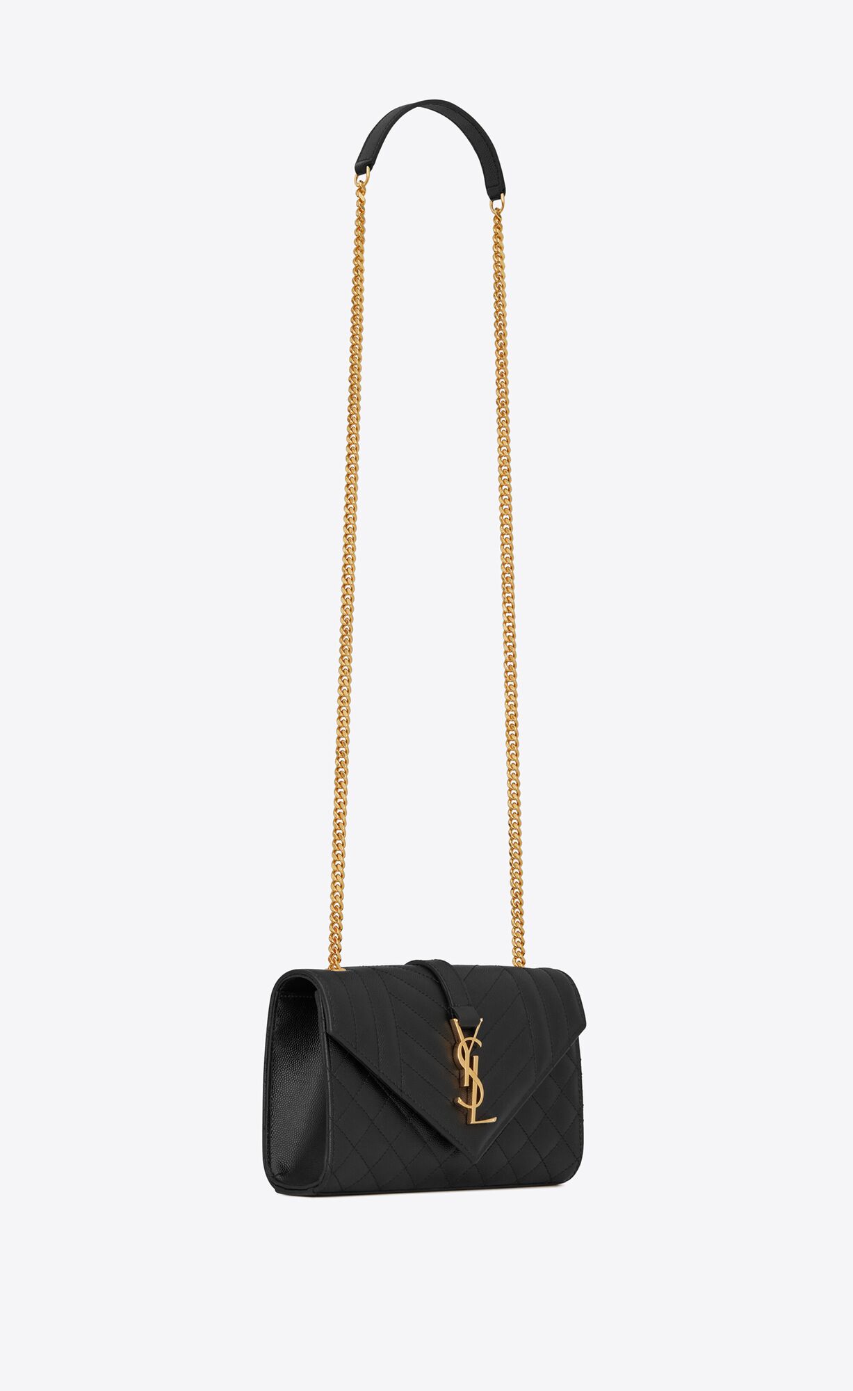ENVELOPE FLAP BAG IN GRAIN DE POUDRE EMBOSSED LEATHER, FEATURING CHEVRON AND DIAMOND QUILT OVERSTITCHING.